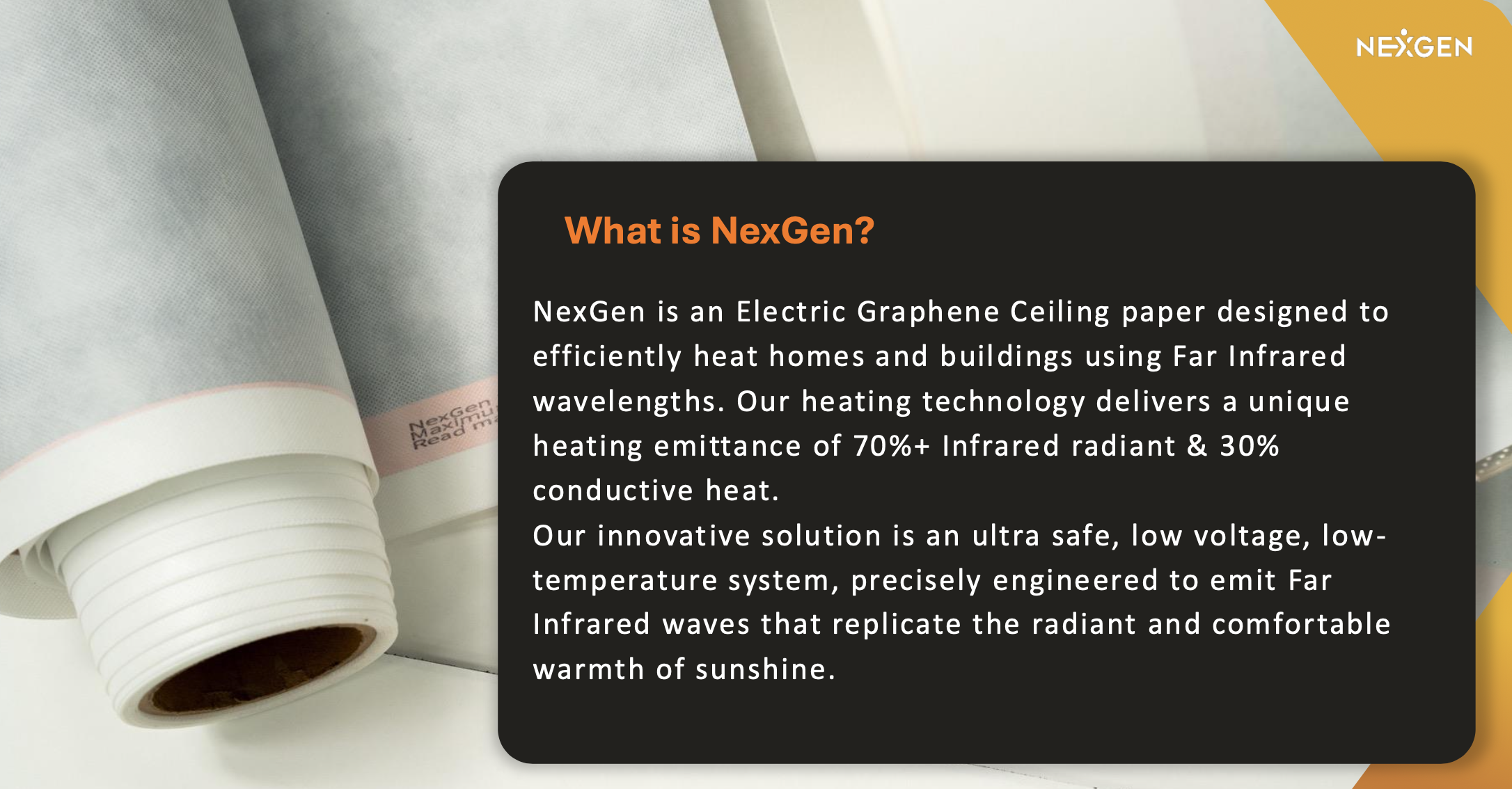 What's different here? The key component and system design in the NexGen product is Graphene, used as an internal component in a laminated paper product that can be used in the same way as wallpaper.